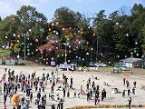 2023年11月13更新 11月11日、陶小学校グラウンドで「ふれあい広場」が開催されました。写真は4年ぶりに再開された“風船飛ばし”の様子です。放たれた風船は高く高く空に吸い込まれていきました。風船を飛ばした当日の夕方に、なんと関東方面の方から『風船を拾いました!』と、ご連絡をいただきました。 |