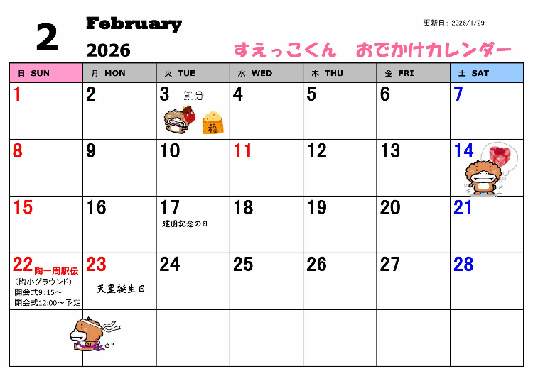 (更新日・出動予定順)★2026年01月29日 すえっこくん2月のおでかけ予定 更新しました。